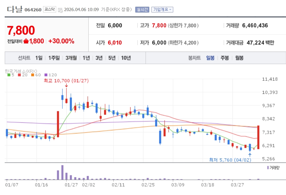 이미지 확대보기6일 한국거래소에 따르면 다날은 오전 10시 09분 기준으로 전 거래일 대비 30.00% 오른 7800원에 거래되고 있다.