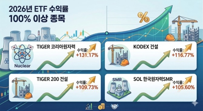 삼성자산운용의 'KODEX 건설'은 연초 대비 116.77%의 수익률을 기록하며 전체 2위에 올랐고, 미래에셋자산운용의 'TIGER 200 건설' 역시 109.73%로 3위를 기록했다. 이는 1위인 'TIGER 코리아원자력'(131%)과 함께 시장의 상승 랠리를 주도한 수치로, 전통의 강자였던 반도체나 2차전지를 압도하는 성적표다.