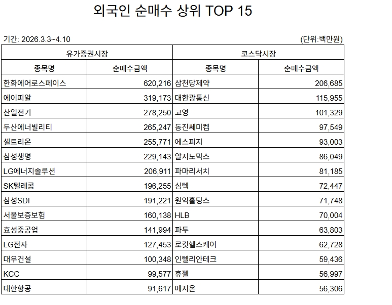 이미지 확대보기13일 글로벌이코노믹이 지난 3월 3일부터 4월 10일까지 외국인 투자자의 매매 동향을 분석한 결과, 외국인은 유가증권시장(KOSPI)에서 한화에어로스페이스, 코스닥(KOSDAQ) 시장에서 삼천당제약을 각각 가장 많이 사들였다. 이 기간은 미-이란 전쟁 여파로 외국인의 전체적인 매도세가 거셌던 시기였으나, 특정 섹터에 대한 집중 매수는 오히려 강화되는 '수급 차별화' 양상이 뚜렷했다.