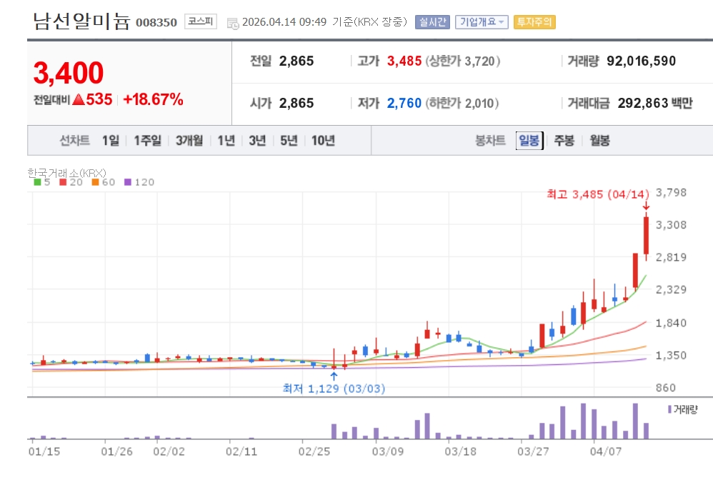 이미지 확대보기한국거래소에 따르면, 남선알미늄은 이날 오전 9시 49분 기준 유가증권시장에서 전날에 비해 18.67% 오른 3400원에 거래되고 있다.
