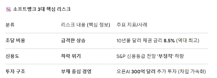 공격적인 투자의 대가는 신용도 하락으로 나타난다. S&P 글로벌 평가는 지난달 소프트뱅크의 신용등급 전망을 '부정적'으로 하향 조정했다. 오픈AI 등 AI 관련 기업에 대한 투자가 소프트뱅크의 유동성을 저해하고 자산 가치의 질을 떨어뜨릴 수 있다는 진단이다.