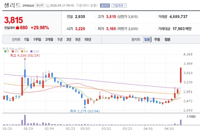 이미지 확대보기17일 한국거래소에 따르면 오전 9시41분 현재 셀리드는 전거래일 대비 29.98% 오른 3815원에 거래되며 상한가를 기록중이다.