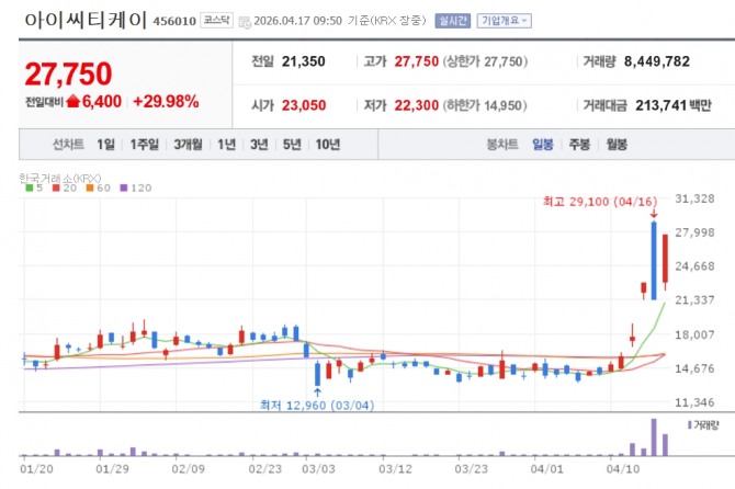 이미지 확대보기17일 한국거래소에 따르면 오전 9시50분 ICTK가 전 거래일 대비 29.98% 오른 2만7750원에 거래 중이다.