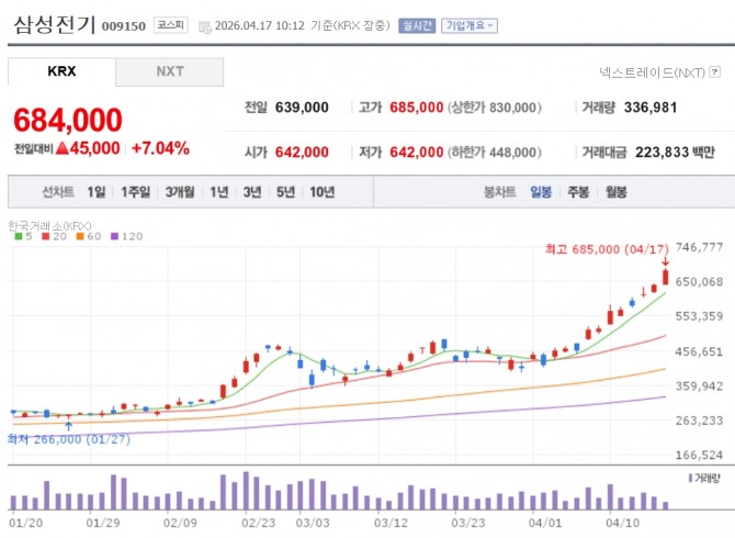 17일 한국거래소에 따르면 오전 10시 12분 현재 삼성전기는 전장보다 7.04% 오른 68만5000원에 거래되며 역대 최고가를 새로 썼다. 주가는 지난 8일부터 8거래일 연속 상승세다.