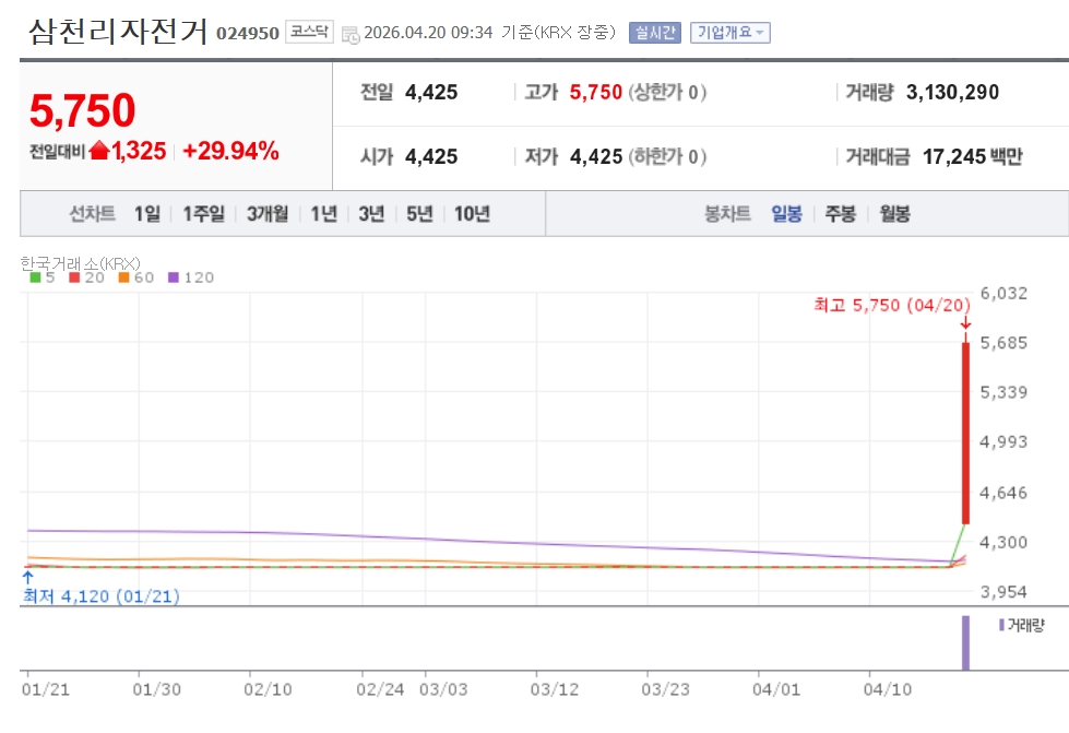 20일 한국거래소에서 삼천리자전거는 오전 9시 34분 현재 전장보다 29.94% 오른 5750원에 거래되고 있다.
