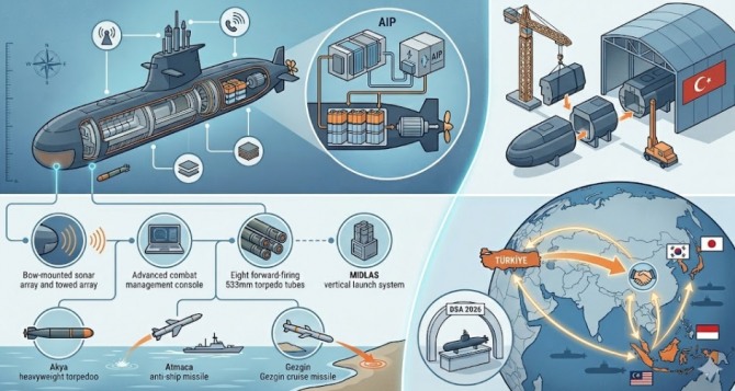 기술 자립도는 아셀산(Aselsan)의 소나, 로켓산(Roketsan)의 아크야(Akya) 중어뢰, 하벨산(Havelsan)의 전투관리체계에서 증명된다. 튀르키예 국방부와 방위산업청이 주도하고 괼주크(Gölcük) 조선소가 건조를 맡은 이 잠수함은 2022년 기본 설계를 마치고, 지난해 12월 강재 절단과 블록 조립을 시작하며 본격적인 양산 체제에 진입했다. 함정 본체뿐만 아니라 무장과 소프트웨어까지 묶은 '통합 패키지'를 제시할 능력을 갖췄다는 평가다.