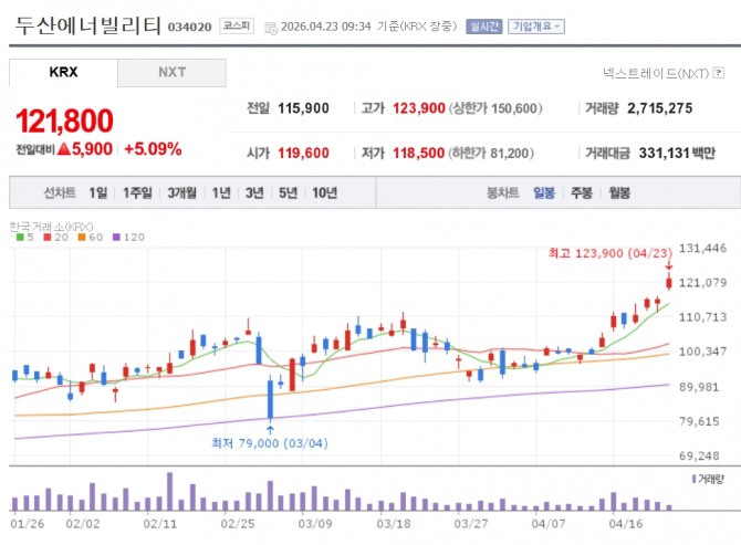 이미지 확대보기23일 한국거래소에 따르면 이날 오전 9시34분 현재 두산에너빌리티는 전거래일 대비 5.09% 오른 12만1800원에 거래 중이다. 장중 12만3900원까지 오르며 52주 신고가를 기록했다. 우진(10.20%), 오르비텍(7.31%), 한전기술(5.54%), 대창솔루션(4.98%), 우리기술(4.54%), 비에이치아이(3.97%), 한전KPS(3.29%) 등 원전 관련주가 동반 상승 중이다.