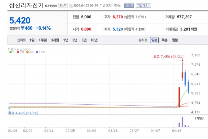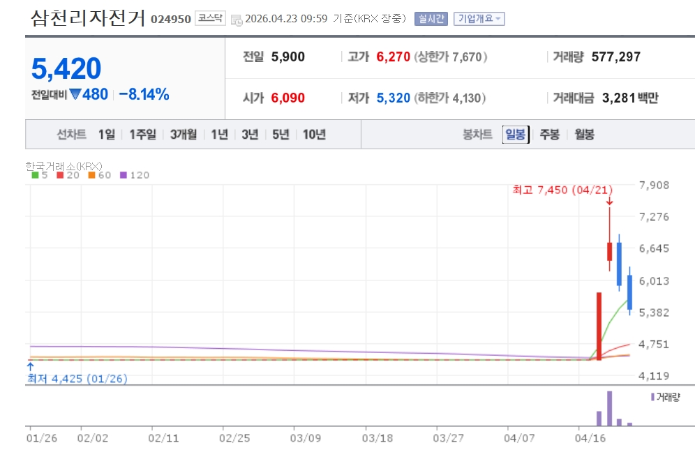 이미지 확대보기23일 한국거래소에 따르면 삼천리자전거는 이날 오전 9시59분 전장대비 8.14% 하락한 5420원을 기록하고 있다. 고점이었던 사흘전 가격인 7450원 대비 27.11%나 떨어졌다.