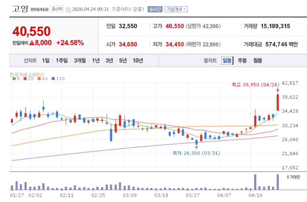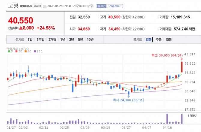 이미지 확대보기24일 한국거래소에 따르면, 오전 9시 31분 현재 고영은 전 거래일 대비 24.58% 오른 4만 550원에 거래중이다. 이날 4만900원을 터치하며 최고가를 기록했다.