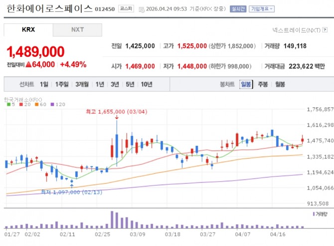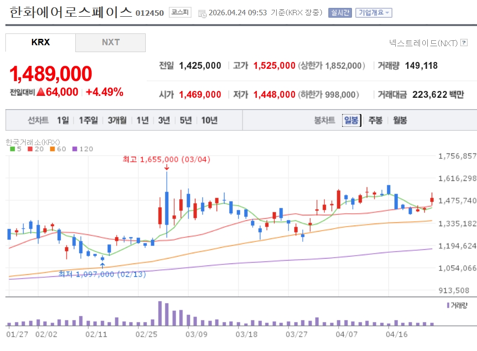 이미지 확대보기24일 한국거래소에 따르면 오전 9시53분 현재 한화에어로스페이스는 전 거래일 대비 4.49% 오른 148만9000원을 기록하고 있다. 장중 한때 7%대까지 상승폭을 확대하기도 했다. LIG디펜스앤에어로스페이스(3.83%) 현대로템(2.97%) 한화시스템(1.77%) 등 다른 방산주도 일제히 오름세다.