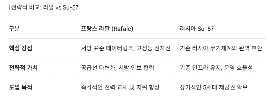 베트남의 선택지는 프랑스 다소(Dassault)사의 '라팔'과 러시아의 'Su-57'로 좁혀진다. 두 기종은 베트남이 추구하는 전략적 지향점을 대변한다.