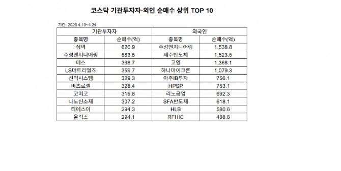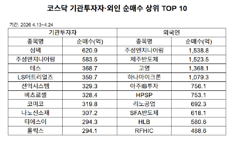 지난 24일 한국거래소에 따르면 지난 4월 13일부터 24일까지 2주간 코스닥 시장에서 외국인과 기관의 수급이 가장 뜨겁게 맞물린 종목은 주성엔지니어링이었다. 주성엔지니어링은 외국인 순매수 1위(1538.8억 원), 기관 순매수 2위(583.5억 원)를 동시에 기록하며 양대 '큰손'의 집중 선택을 받았다.